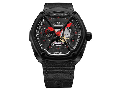 Dietrich Men's Organic Time 46mm Automatic Watch DIETRICH-OT-2. The case is built with high-quality Black PVD Stainless Steel and can withstand up to 50 M of water resistance. The dial is Skeleton and protected by a scratch-resistant sapphire crystal. The Bracelet is Black Nylon with a Pin Buckle. The movement is Made in Japan Automatic. (DIETRICH-OT-2)