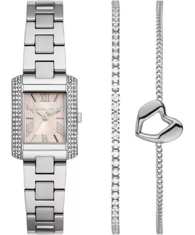 Michael Kors Women's Emery Quartz Watch. The case is built with high-quality Stainless Steel and can withstand up to 50 m (165 feet) of water resistance. The dial is Pink and protected by a Mineral Crystal. The Bracelet is Silver Stainless Steel with a Deployment Clasp. The movement is Quartz. (MK7514SET)