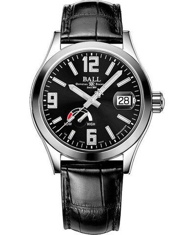 Ball Engineer III Pioneer Power Reserve PM9026C-LLCFJ-BK is an elegant watch made of high-quality materials that will perfectly complement women's wear. This timepiece is powered by a precise automatic movement. The case is made of solid stainless steel, covered with a black coating.Thanks to the black leather strap, the watch looks beautiful and perfectly fits a wrist. A clear black dial is covered by a sapphire crystal, which is believed to be one of the best and most durable materials. The watch with 100 meters of water resistance means that it can be used for swimming and freediving