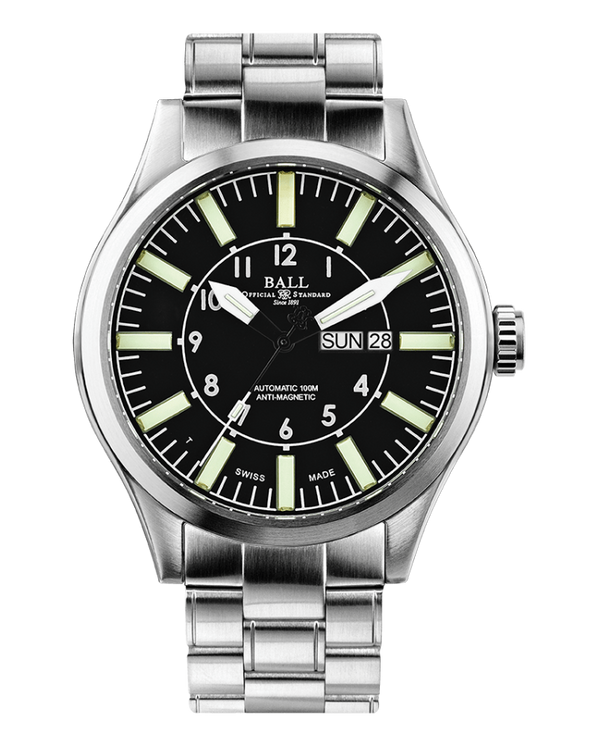 The Ball Engineer Master II Aviator is a robust and sophisticated timepiece powered by the automatic BALL RR1102 movement. Encased in a 46mm stainless steel case with a height of 13.3mm, it offers resilience with a shock resistance of 5,000Gs and antimagnetic properties of 4,800A/m. The watch features 15 micro gas tubes on the hour, minute, and second hands, as well as the dial, ensuring optimal night readability. Functions include hours, minutes, sweep seconds, and day and date display. The watch is water-resistant up to 100m and is adorned with an anti-reflective sapphire crystal. The black dial is complemented by a stainless steel bracelet with a folding buckle, giving the watch a sleek finish.