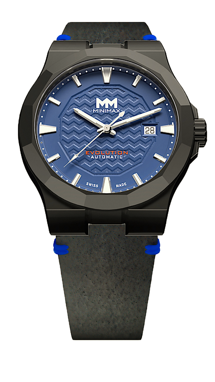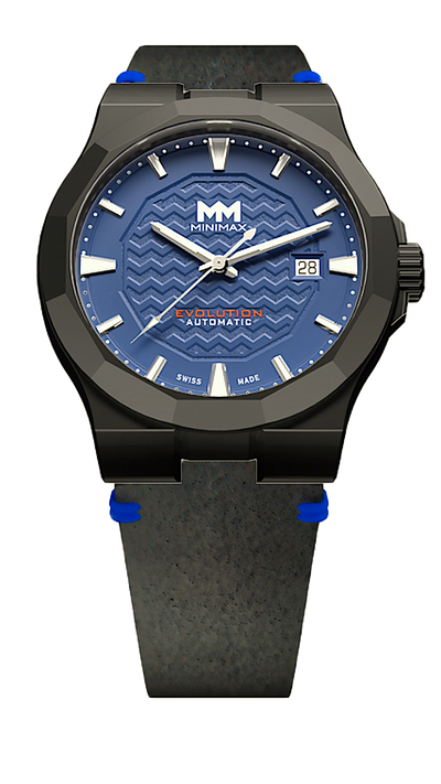 Minimax Evolution DLC stainless steel watch with blue dial, black leather band with blue stitching. Includes 3-in-1 Minimax tool.