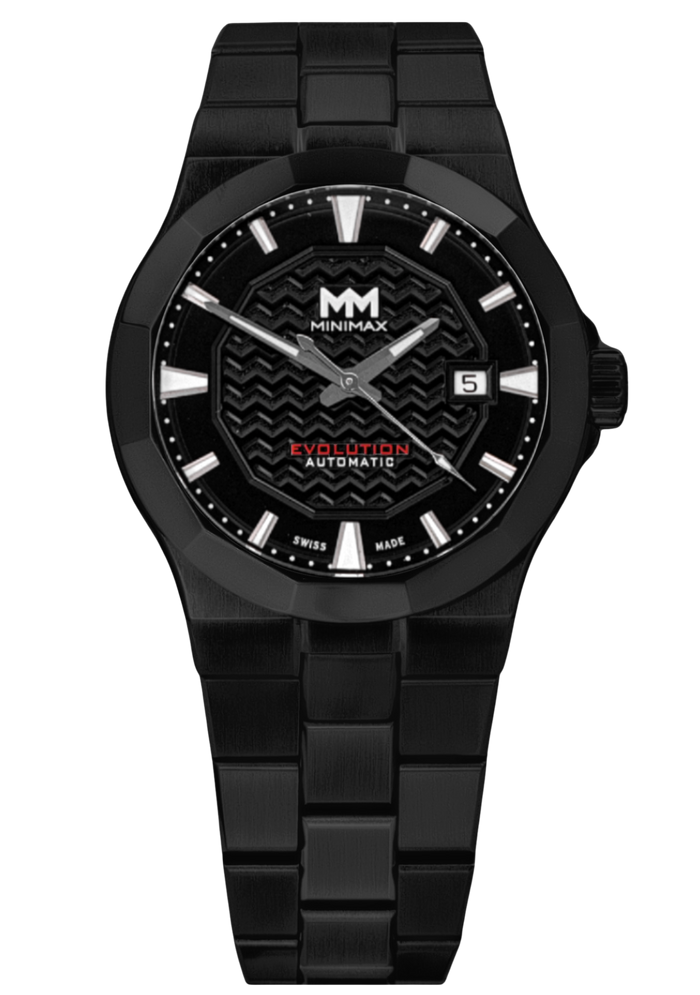 Minimax Evolution DLC stainless steel watch with black dial, black leather band with white stitching and spare DLC stainless steel link bracelet. Includes 3-in-1 Minimax tool.