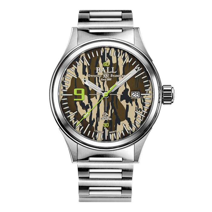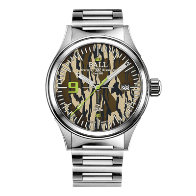 Movement Automatic caliber BALL RR1103 Functions 63 micro gas tubes on hour, minute, second hands and dial for night reading capability Shock resistant to 5,000Gs Water resistant to 100m/330ft Hours, minutes, sweep seconds and date Case Stainless steel Ø 40mm, height 11.3mm Anti-reflective sapphire crystal Screwed-in crown Band Stainless steel bracelet with folding buckle Dial Black or camouflage