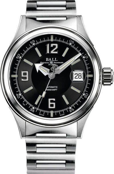 Movement Automatic caliber BALL RR1103 Functions 15 micro gas tubes on hour, minute, second hands and dial for night reading capability Shock resistant to 5,000Gs Water resistant to 100m/330ft Hours, minutes, sweep seconds and magnified date Case Stainless steel Ø 40mm, height 11.4mm Anti-reflective sapphire crystal Screwed-in crown Band Stainless steel bracelet with folding buckle or rubber strap with standard buckle Dial Black with white index
