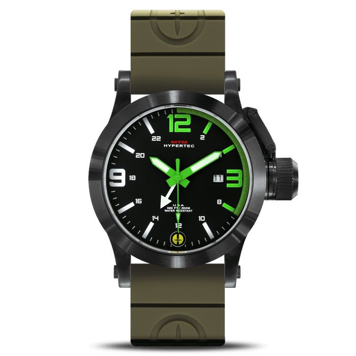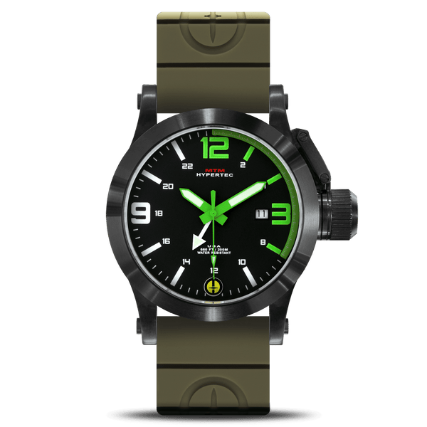 MTMs Hypertec-X offers many of the same rugged components of our military-style watches. Precision timing Swiss-made quartz movement ensures this watch will last for many years. This watch can resist depths up to 660 feet/200 meters, at night, its super luminous hands glow, allowing for easy readability. A date window and 24-hour indicator are both featured in the dial, which is securely enclosed by tempered glass.