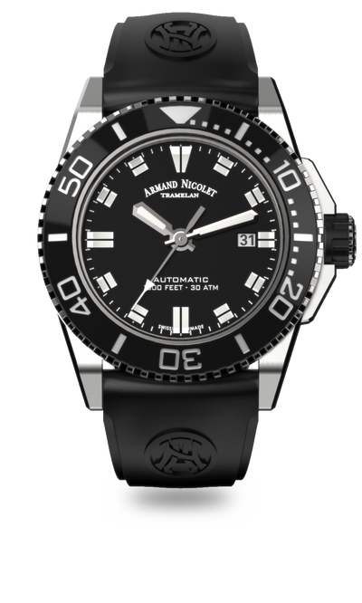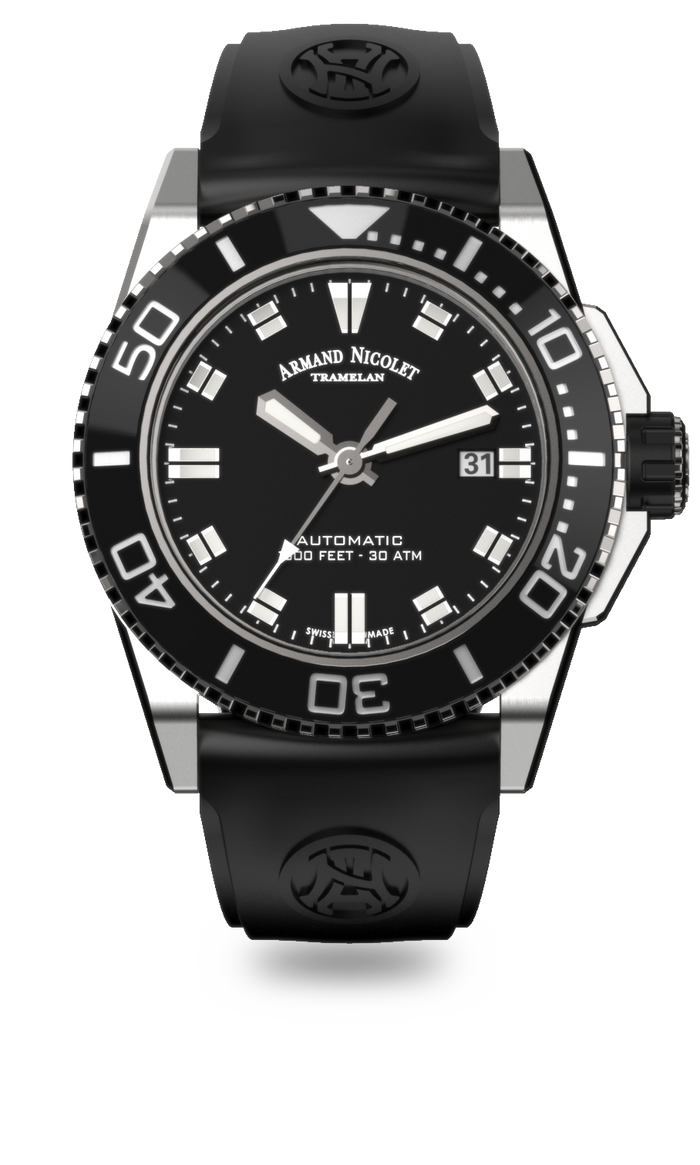 Caliber AN200 for Date (based on ETA 2824-2 or SW-200 modified per Armand Nicolet’s specifications).Dial with luminous indexes and hands. Case with antiglare treated sapphire crystal. Screwed back. Turning black ceramic bezel.