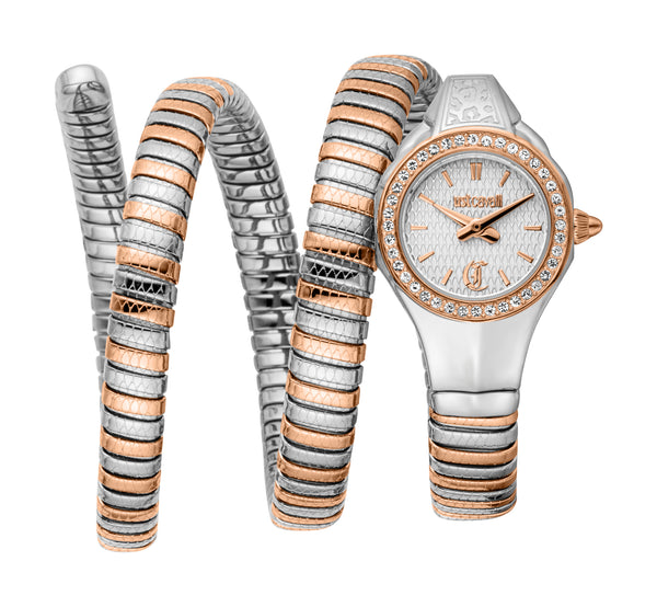 Just Cavalli Women's Snake 316L Stainless Steel Watch. The case is built with high-quality Stainless Steel and can withstand up to 30 M of water resistance. The dial is Silver and protected by a Mineral crystal. The Bracelet is Silver and Rose Gold Stainless Steel. The movement is Quartz. (JC1L355M0065)