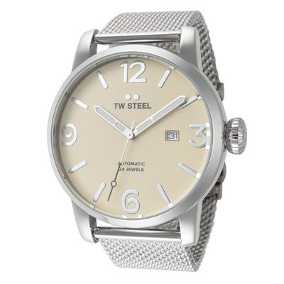 TW Steel Men's Maverick Automatic Watch. The case is built with high-quality Stainless Steel and can withstand up to 100 m (330 feet) of water resistance. The dial is Beige and protected by a Mineral Crystal. The Bracelet is Silver Stainless Steel with a Deployment Clasp. The movement is Made in Japan Automatic. (TWS-MB6)
