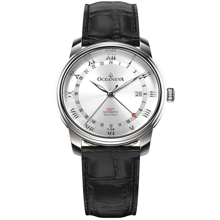 Oceaneva Men's OceanTrek Automatic GMT 200m Silver Leather Watch Silver/Black | Silver Dial