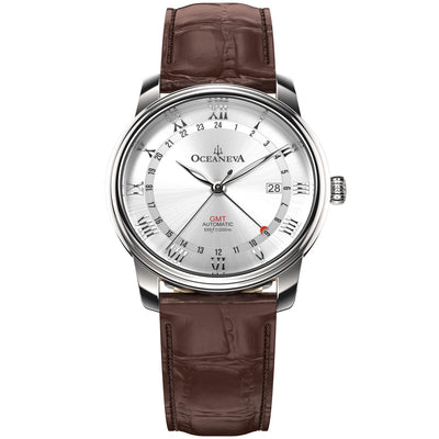 Oceaneva Men's OceanTrek Automatic GMT 200m Silver Leather Watch Silver/Brown | Silver Dial