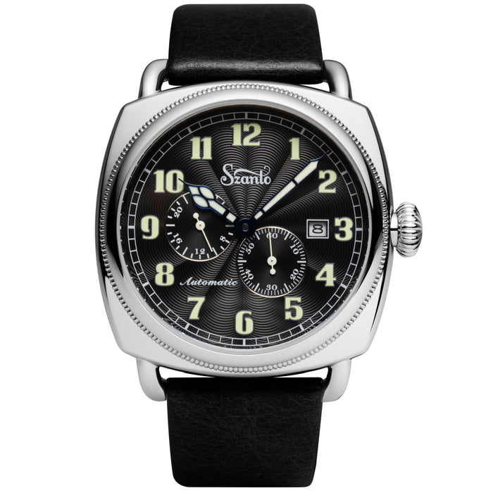 Szanto watches are a modern take on classic vintage watch designs with classic styling and the highest quality workmanship. Szantos modern components offer accuracy and affordability. The Automatic Officer Coin Cushion Series offers a 316L Polished 42.5mm Stainless Steel Case with Exhibition Crystal Caseback, Highly Scratch Resistant K1 Mineral Crystal, Push-in Half-Onion Shaped Crown, Japan Miyota 21 Jewel Automatic Movement with Hour Hand, Minute Hand, 24 Hour Subdial & Small Seconds Subdial, Guilloche finished dial with Arabic numerals, Swiss SuperLuminova fill on the hands and numbers, Water resistance of 100 Meters, and a Genuine Calf Leather Strap with Signature Szanto Stainless Steel Buckle. Styles from the past re-imagined for today ---so take a step back in time with Szanto!
