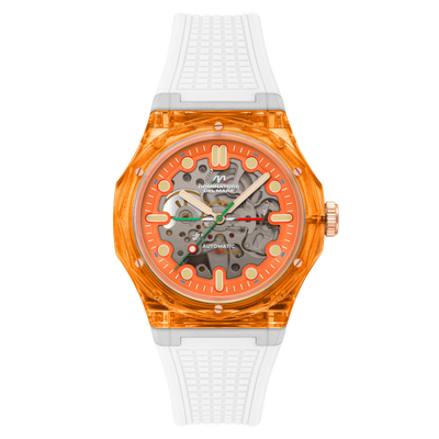 Ravello Automatic is a bold tribute to the natural beauty and vibrant spirit of Ravello, the jewel of the Amalfi Coast. Its intricate skeleton dial reveals the artistry of its automatic movement, while the semi-transparent case captures the glow of Amalfi sunsets and the vibrance of Ravellos festivals. Like the coastal town, the Ravello Automatic marks a remarkable presence on your wrist.