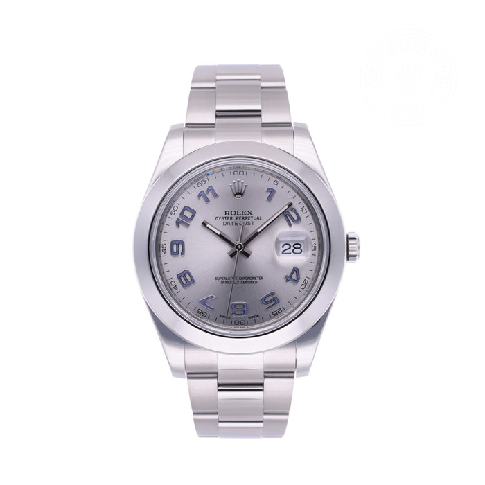 This pre-owned Rolex Datejust II (Ref. 116300) features a 41mm Oystersteel case with a solid caseback and screw-down crown. Its rhodium dial is protected by a sapphire crystal, while the automatic Caliber 3136 movement delivers a 48-hour power reserve. Paired with an Oystersteel bracelet, this Swiss-made watch offers both elegance and durability.