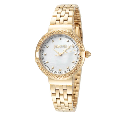 Just Cavalli Women's SET 30mm Watch. The case is built with high-quality Stainless Steel and can with stand up to 30 m (100 feet) of water resistance. The dial is White and protected by a Mineral Crystal. The Bracelet is Gold Stainless Steel and the movement is Quartz (JC1L311M0025)