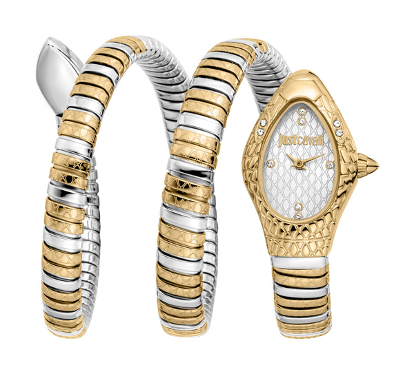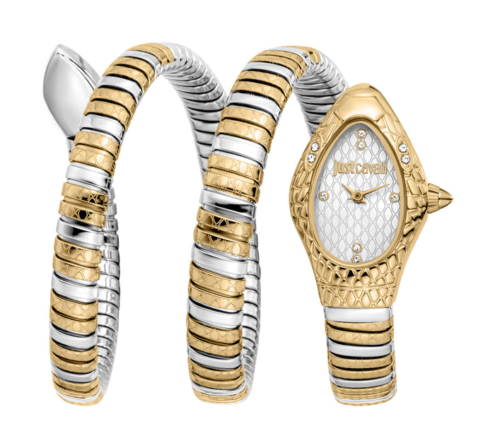 Just Cavalli Women's Snake Quartz Watch. The case is built with high-quality Stainless Steel and can withstand up to 30 m (100 feet) of water resistance. The dial is Silver and protected by a Mineral Crystal. The Bracelet is Silver and Gold Stainless Steel with a Deployment Clasp. The movement is Quartz. (JC1L374M0055)