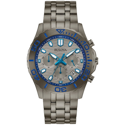 Bulova Men's Sport 42mm Watch. The case is built with high-quality Grey Stainless Steel and can with stand up to 50 m (165 feet) of water resistance. The dial is Grey and protected by a Mineral Crystal. The Bracelet is Stainless Steel and the movement is Quartz (98B434)