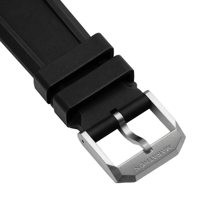 Manufactured in La Chaux-de-Fonds, Switzerland, our 3 Piece Rubber Strap Kit is crafted from FKM Rubber to meet the requirements of high-performance military applications. The 3-Piece kit comes with one (6 o'clock) tail piece with 8 adjustment holes, and two (12 o'clock) buckle pieces of different sizing that allow the wearer to tailor the length to fit their wrist size.