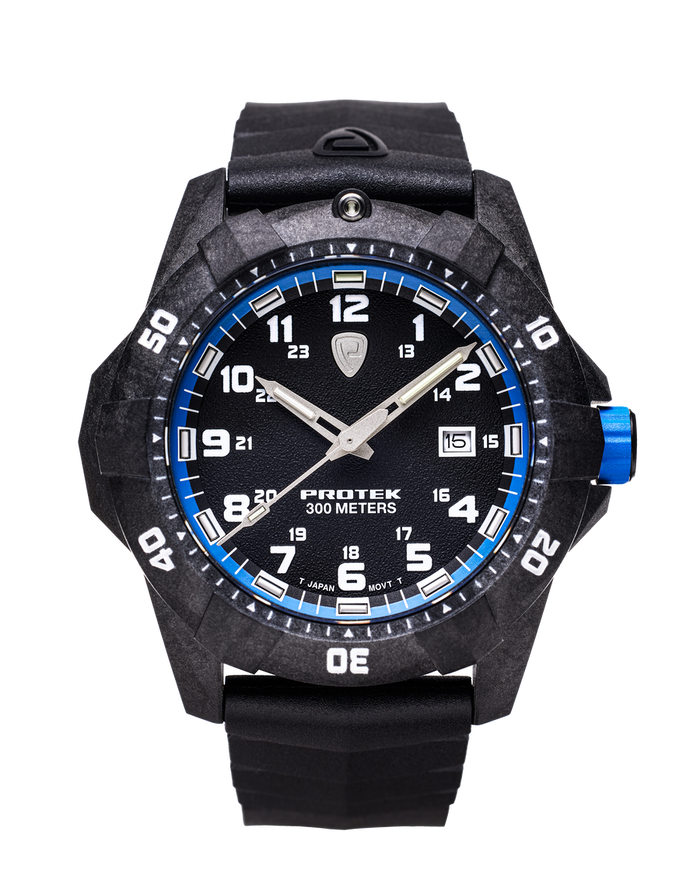Time Concepts introduces ProTek, its new brand of tritium tactical watches. ProTek is designed for Law Enforcement, Fire Fighters, SWAT, Tactical, Military, Special Forces, and First Responders. ProTek is a no-excuses brand that is Rugged at Heart and built to handle what life demands in any environment, lending credence to the tag line All Terrain Watches. ProTek watches were submitted to the US Marine Corps and were approved as an Official Watch of the USMC based on the accuracy, durability and superior ProGlo illumination that make these ideal timepieces to serve Marines in the line of duty, and in their daily lives. Specifications: 42mm Carbon Composite Case with a 60-Click Dive Timing Bezel, 316L Stainless Steel Embossed Screw Caseback, Screw down crown with multiple 0-rings, Sapphire Crystal with Antireflective Coating, Genuine Rubber Strap (22mm x 20mm), Japan Quartz Miyota 2S60 3 Hand & Date Movement with 10 Year Battery, Water Resistant to 300 Meters. ProGlo Tritium Lume in tubes on the hands and dial markers. Swiss self-powered ProGlo T25 illumination system is 100X brighter than conventional lume and glows continuously for 25 years without a need to be "charged" by an external light source. Weight: 73.2 grams. Case Thickness: 13.95mm
