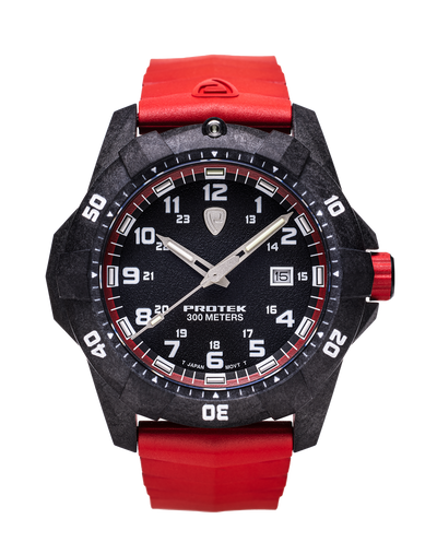 Time Concepts introduces ProTek, its new brand of tritium tactical watches. ProTek is designed for Law Enforcement, Fire Fighters, SWAT, Tactical, Military, Special Forces, and First Responders. ProTek is a no-excuses brand that is Rugged at Heart and built to handle what life demands in any environment, lending credence to the tag line All Terrain Watches. ProTek watches were submitted to the US Marine Corps and were approved as an Official Watch of the USMC based on the accuracy, durability and superior ProGlo illumination that make these ideal timepieces to serve Marines in the line of duty, and in their daily lives. Specifications: 42mm Carbon Composite Case with a 60-Click Dive Timing Bezel, 316L Stainless Steel Embossed Screw Caseback, Screw down crown with multiple 0-rings, Sapphire Crystal with Antireflective Coating, Genuine Rubber Strap (22mm x 20mm), Japan Quartz Miyota 2S60 3 Hand & Date Movement with 10 Year Battery, Water Resistant to 300 Meters. ProGlo Tritium Lume in tubes on the hands and dial markers. Swiss self-powered ProGlo T25 illumination system is 100X brighter than conventional lume and glows continuously for 25 years without a need to be "charged" by an external light source. Weight: 73.2 grams. Case Thickness: 13.95mm