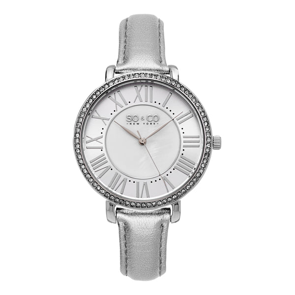 Silver Tone Case on Silver Genuine Leather Ultra Thin Strap, White Mother of Pearl Center Dial with Silver Tone Outer Dial, Crystal Filled Bezel, with Silver Tone and Black Accents
