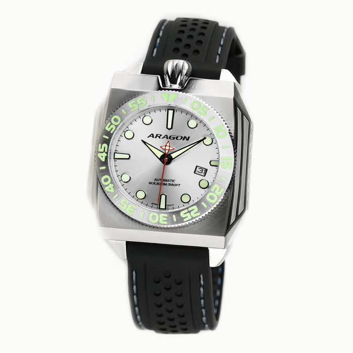 Don't just wear your watch - pilot it into the future. Like an intergalactic commando. The new Concept S from ARAGON takes the idea of telling time and adds some serious adventure to it. An angular cut shaped stainless steel case like a spaceship, CNC machine cut grid line make it like the intake of the jet, with a rocket jet engine like custom crown. Concept S looks ready to rocket off your wrist.