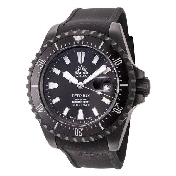 Solar Aqua Men's Deep Bay Automatic Watch. The case is built with high-quality Stainless Steel and can withstand up to 2136 m (7008 feet) of water resistance. The dial is Black and protected by a Sapphire Crystal Scratch Resistant. The Strap is Black Silicone with a Pin Buckle. The movement is Swiss-Made Automatic. (SA0030.0011-1)