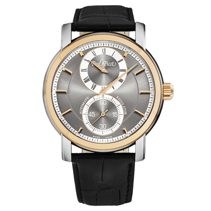 The Paul Picot Firshire P0481.SRG.8604/Grey exemplifies timeless elegance and precision. This men's timepiece features a 42mm round stainless steel case with a captivating grey dial. Its automatic movement powers essential functions like hours, minutes, and small seconds, showcased beneath a scratch-resistant sapphire crystal.
