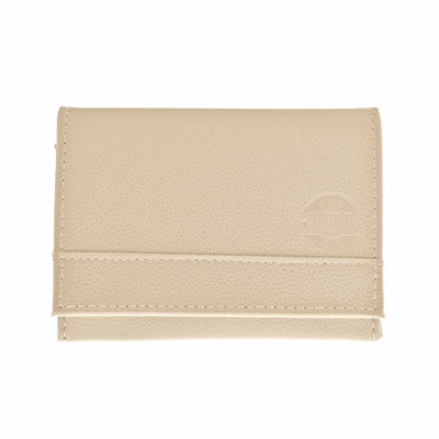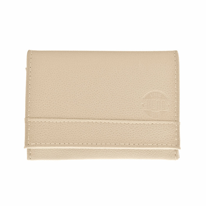 Material: Embrodermic material a Leather like cloth also referred to as poromeric leathers which are a group of synthetic "breathable" substitutes designed to look and feel like "real" leather. It is hypoallergenic and easy to maintain. It is soft to the touch yet withstands rugged use. Size: Closed 4.25 inches in width 3 inches in height Size: Open 6.25 inches Interior hidden structured Nylon for strength Interior One side: has pocket with clear window. Other side: 2 pockets for credit cards. Behind the 2 pockets for credit cards is an open pocket that extend 1 inch opening Machined stitched. NO Glue