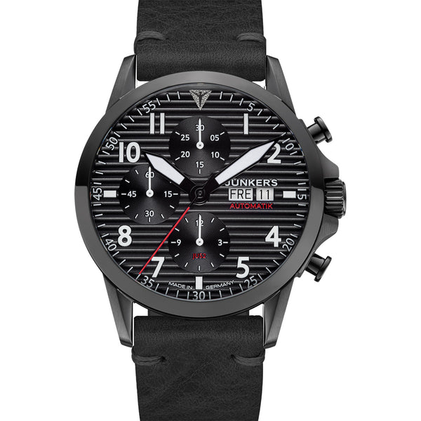 Extended Ship Time From Germany. Automatic chronograph color black 42 mm leather strap No. 929.01.02 - The Junkers JU52 Aviator Chronograph is equipped with all the highlights you would expect from a luxury watch. The JU52 airplane : With the Junkers JU 52 chronograph, you are putting a legend on your wrist. For a long time, the JU52 was the most successful commercial aircraft in the world. Lufthansa alone had over 100 examples in its fleet, and most airlines around the world had a JU52 in their fleet. The three-engined aircraft opened up new dimensions in global air transport and served its inventor's goal of bringing the world and people closer together.
