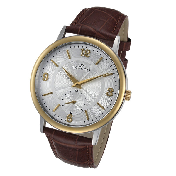 With a white textured dial featuring geometric shapes, this stylish watch is the perfect combination of white and gold. A brown faux leather band hold the gold and white textured face. Gold tone Arabic numbers, ticks, and hands accompany the white background while also adding flair to the smaller second timekeeping section at the center bottom. Black tick marks line the outer edge of the face for accurate minute timekeeping.SpecificationsBrand Name: Rougois (pronounced Roojwa)Model number: 801G-BNTechniqueCase Material: Stainless Steel (Two tone gold & silver)Movement Type: QuartzCalendar Type: noneCrystal: MineralWater Resistant: 3 ATMDesignStyle: AnalogCase Shape: RoundDiameter: 42 mmCase Thickness: 6.8 mmColor of the dial: White (Textured Design)Hands Color: GoldCaseback: Snap-downCrown: Push/pullBandBand Color: BrownType Band: LeatherClasp Type: BuckleStrap: 22 mm width / 9.125 inch longWarranty: 1 Year