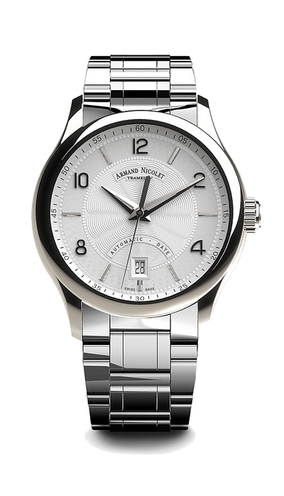 M02-4 - Watch in stainless steel case . Silvered dial and stainless steel bracelet.Mechanical automatic movement with Date functions. Calibre AN200 for Date (based on ETA 2824-2 or SW-200 modified per Armand Nicolet’s specifications). Guilloché decorated dial with applied indexes, Arabic numbers.