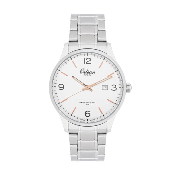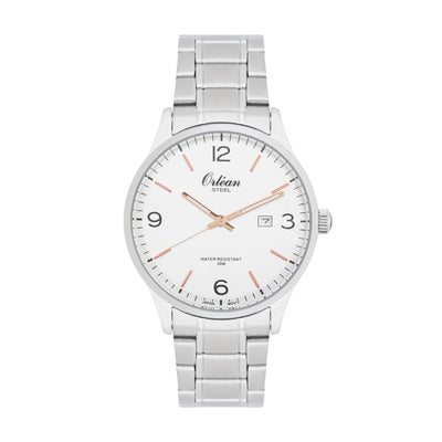 Orlean 41mm Analog Mens Watch, Full Stainless Steel, Japanese Quartz Movement, Date Silver / White Dial 3 ATM ME3427
