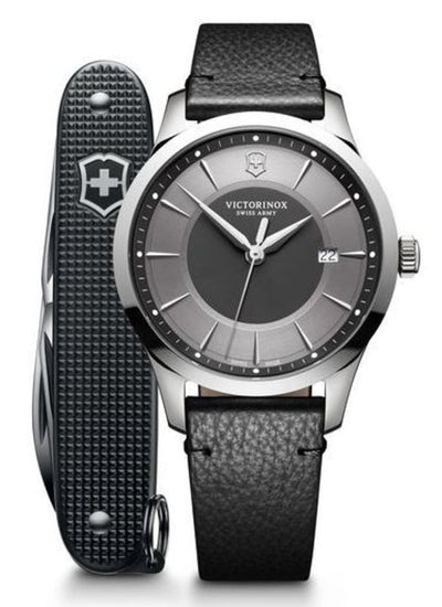 Brand New Authentic Victorinox Swiss Army Alliance Quartz Grey Dial Black Leather Strap Men's Fashion Watch Model 241804. Brushed and Polished Stainless Steel case with Black Leather strap. Brushed and Polished Stainless Steel Tang clasp. Smooth bezel. Dial description: Luminous Silver Tone Hands and Stick Hour Markers with Minute Markers Around the Outer Rim and the Date at 3 o'clock on a Grey dial. Swiss Quartz movement. Chronograph sub-dials display: Date. Calendar: Date at 3 o'clock. Powered by Battery Powered engine. Watch functions: Date, Hour, Minute, Second. Push-Pull crown. Scratch Resistant Sapphire crystal. Unique case shape. Case size: 40mm. Case thickness: 9mm. Solid case back. 100 Meters - 330 Feet water resistant. 5-year WatchMaxx warranty.