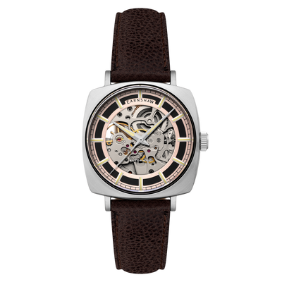 Inspired by one of Londons historic gateways, the Moorgate pays tribute to a place where tradition and innovation converge.Its polished 40mm square case draws attention with sleek boldness. The skeleton dial reveals the intricate automatic movement within. Paired with an exhibition caseback, the Moorgate invites you to experience the artistry of time.