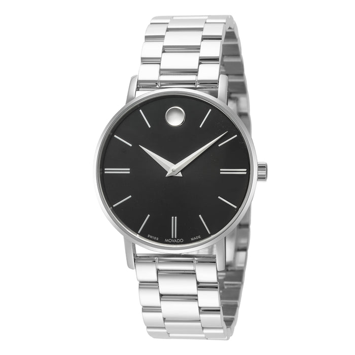 Movado Unisex Corporate Quartz Watch. The case is built with high-quality Stainless Steel and can withstand up to 30 m (100 feet) of water resistance. The dial is Black and protected by a Sapphire Crystal Scratch Resistant. The Bracelet is Silver Stainless Steel with a Deployment Clasp. The movement is Swiss-Made Quartz. (0608037)