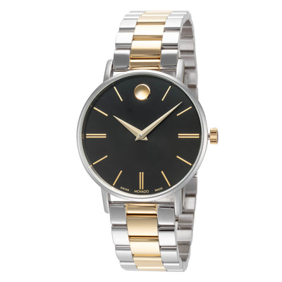 Movado Unisex Corporate Quartz Watch. The case is built with high-quality Stainless Steel and can withstand up to 30 m (100 feet) of water resistance. The dial is Black and protected by a Sapphire Crystal Scratch Resistant. The Bracelet is Silver and Gold Stainless Steel with a Deployment Clasp. The movement is Swiss-Made Quartz. (0608038)