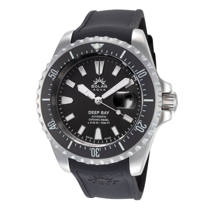 Solar Aqua Men's Deep Bay Automatic Watch. The case is built with high-quality Stainless Steel and can withstand up to 2136 m (7008 feet) of water resistance. The dial is Black and protected by a Sapphire Crystal Scratch Resistant. The Strap is Black Silicone with a Pin Buckle. The movement is Swiss-Made Automatic. (SA0030.0021-1)