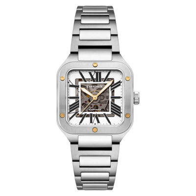 Encased in a compact square silhouette at 36.5mm, the Lennox reveals the intricate mechanics of its automatic skeleton movement. Finished with a stainless steel bracelet and butterfly clasp, this square-cased skeleton watch balances precision with personality.
