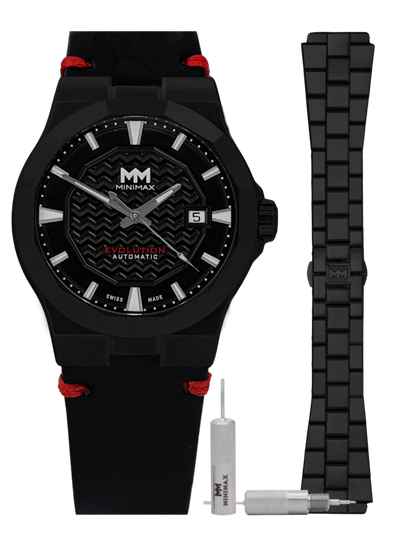 Minimax Evolution DLC stainless steel watch with black dial, black leather band with red stitching and spare DLC stainless steel link bracelet. Includes 3-in-1 Minimax tool.