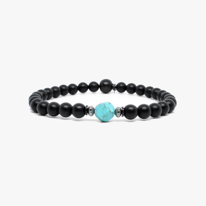 Starcut Turquoise, Black Onyx, Sterling Details. Bead Size: 6mm