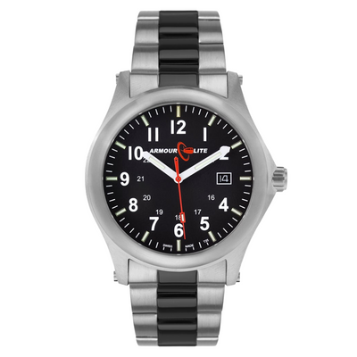 The ArmourLite Field Series watches with long-lasting Swiss tritium illumination have been a very popular staple in our collection since 2011. The newest generation of these ultra tough and high performance Swiss Made watches introduces a slimmer and more lightweight 42mm case, while retaining the classic and distinctive design of a field watch. Each model in this series is protected by our unique shatterproof Armourglass crystal that has a hardness rating of 6,000 Vickers — whereas most watch crystals are only rated to 700 Vickers. For the utmost in reliability and timekeeping accuracy, each watch is powered by a maintenance-free Swiss Made Ronda 715 quartz movement with a date display at 3:00 and a low-battery indicator. The functional yet easy to read dial features Arabic numerals for both the 12 and 24 hour markings. Your watch becomes a lot more useful as you can easily tell the time in not only the day, but also at night with the help of 15 self-powered tritium tubes that are set into each of the 3 hands and at every hour on the dial. The case and all components of the watch are constructed out of hypoallergenic and durable 316L stainless steel. The screw-down crown and caseback ensure an adventure-ready water resistance of 100 meters. In lieu of the standard spring bar pins, heavy-duty screw bars secure the band firmly in place for strenuous activities. Overall, this watch will provide years of reliable performance no matter where you take it while looking stylish on your wrist. It is built for both city life and the great outdoors! Where will your watch take you?