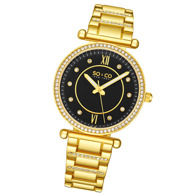 Women's Crystal Studded Gold-tone Case and Bracelet, Black Dial Watch