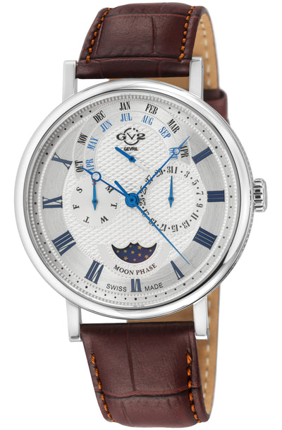 Introducing the GV2 Men's Maestro Watch—a refined timepiece that orchestrates elegance with precision. Crafted for the modern man who commands with sophistication, this Swiss Quartz watch from the Maestro Collection combines intricate details with a robust design. The 48mm 316L stainless steel case is both imposing and graceful, enhanced by a distinctive bezel ring. Its textured dial features three functional sub-dials and a moon phase indicator, showcasing meticulous artistry and practical utility. Inspired by the Italian term Maestro, this watch is a tribute to leadership and mastery, combining style and substance in equal measure.