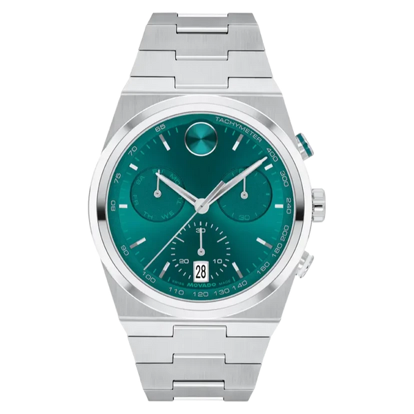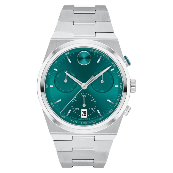 Movado Men's Bold Quest 42mm Quartz Chronograph Watch 3601200. The case is built with high-quality Stainless Steel and can withstand up to 30 M of water resistance. The dial is Green and protected by a K1 crystal. The Bracelet is Silver Stainless Steel. The movement is Swiss-Made Quartz. (3601200)