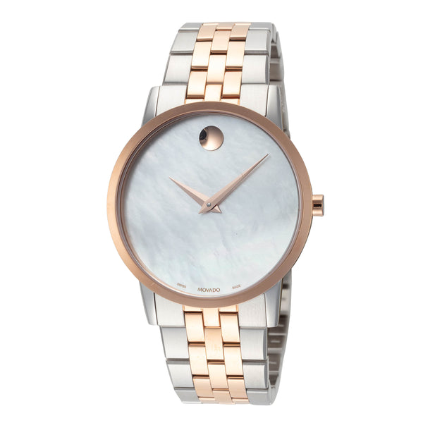 Movado Women's Museum Quartz Watch. The case is built with high-quality Stainless Steel and can withstand up to 30 m (100 feet) of water resistance. The dial is White Mother-of-Pearl and protected by a Sapphire Crystal Scratch Resistant. The Bracelet is Silver and Gold Stainless Steel with a Deployment Clasp. The movement is Swiss-Made Quartz. (0607629)