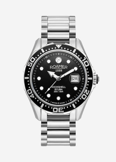 EXTENDED SHIPPING TIME. The latest evolution of one of the most famous Roamer families, the Rockshell Mark III Scuba impresses with a timeless sporty-elegant design, smartly blending modern and vintage features. Water-resistant up to 20 ATM, the Rockshell Mark III Scuba is a perfect companion for water sports and outdoor activities, but also a beautiful watch to wear for any occasion. The rotating bezel is excellently labeled for perfectlegibility. It allows the diving time to be accurately tracked in minutes thanksto the triangular luminous marker. A screw-down fluted crown assures that no water can find its way into the Scuba, even at a diving depth of 200 m.