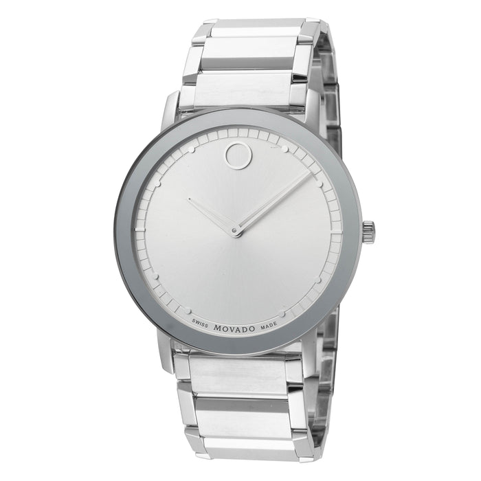 Movado Men's Sapphire Quartz Watch. The case is built with high-quality Stainless Steel and can withstand up to 30 m (100 feet) of water resistance. The dial is Silver and protected by a Sapphire Crystal Scratch Resistant. The Bracelet is Silver Stainless Steel with a Deployment Clasp. The movement is Swiss-Made Quartz. (0607407)