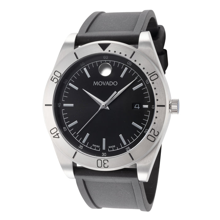 Movado Men's Sport Quartz Watch. The case is built with high-quality Stainless Steel and can withstand up to 30 m (100 feet) of water resistance. The dial is Black and protected by a Sapphire Crystal Scratch Resistant. The Strap is Black Rubber with a Pin Buckle. The movement is Swiss-Made Quartz. (0607989)