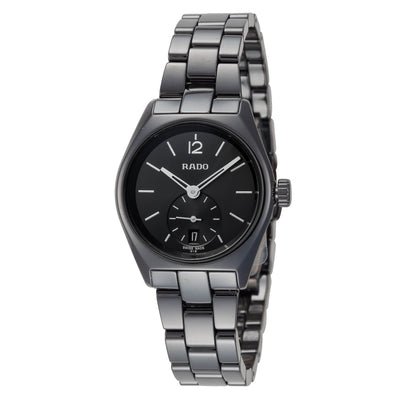 Rado Women's True Specchio Quartz Watch. The case is built with high-quality Titanium and Ceramic and can withstand up to 50 m (165 feet) of water resistance. The dial is Black and protected by a Sapphire Crystal Scratch Resistant. The Bracelet is Black Titanium and Ceramic with a Deployment Clasp. The movement is Swiss-Made Quartz. (R27084152)