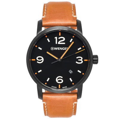 NEW WITH TAGS, ORIGINAL BOX AND BOOKLETWENGER - "Urban Metro" Men's Watch; Black Tone Case, Black Dial, Brown Leather Bracelet, Analog Quartz Movement - 01.1741.134MSRP $195.00Wenger 01.1741.134 Urban Metro Men's watch features a 42mm wide and 9.4mm thick black stainless steel case with a fixed bezel and textured pull and push crown. Wenger 01.1741.134 is powered by Swiss quartz movement.Case Size: 42 mmCase Material: Stainless SteelCase Shape: RoundCase Color: BlackCase Thickness: 9.4 mmCase Back: Screw DownMovement: Swiss QuartzCalendar: DateFeatures: Fixed BezelFunctions: Hours, Minutes and Seconds, 12 Hour DialDial: BlackMarker Style: Index and Arabic NumeralWater Resistant: 100 MetersCrown: Pull and PushCrystal: Sapphire Coated MineralBand Material: LeatherBand Color: BrownBand Width: 22mmClasp Type: Buckle